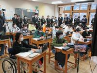 児童は、すこし緊張しながらもいつも通りに、仲間と交流しながら、先生の話を真剣に聞き、課題に取り組んでいました。